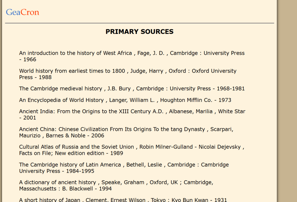 In conclusion, I would say that GeaCron has some, if limited, educational value. In terms of straightforward reliability, it is a facile tool to get a surface-level understanding of what the world was like at any given point in time. However, my impression from using GeaCron periodically over the years is that as a project it may have been somewhat over-ambitious in scope. In its description, GeaCron states that it seeks to be the “most powerful geo-temporal tool for history research, education, and findings dissemination”, that streamlines and synthesizes the overwhelming amount of history knowledge that can be found online, but the lack of detail and nuance that comes with the GeaCron project make it less than actually useful to anyone attempting to gain serious understanding. If GeaCron has a way of challenging narratives or bringing marginalized histories to light, it is in the fact that it puts all historical events in broader context- while observing the growth of one empire or civilization one can see how the rest of the world fared at the same time. Yet, it could also reinforce some significant misconceptions by back-projecting modern conceptions of statehood to historical periods where they are not necessarily applicable.